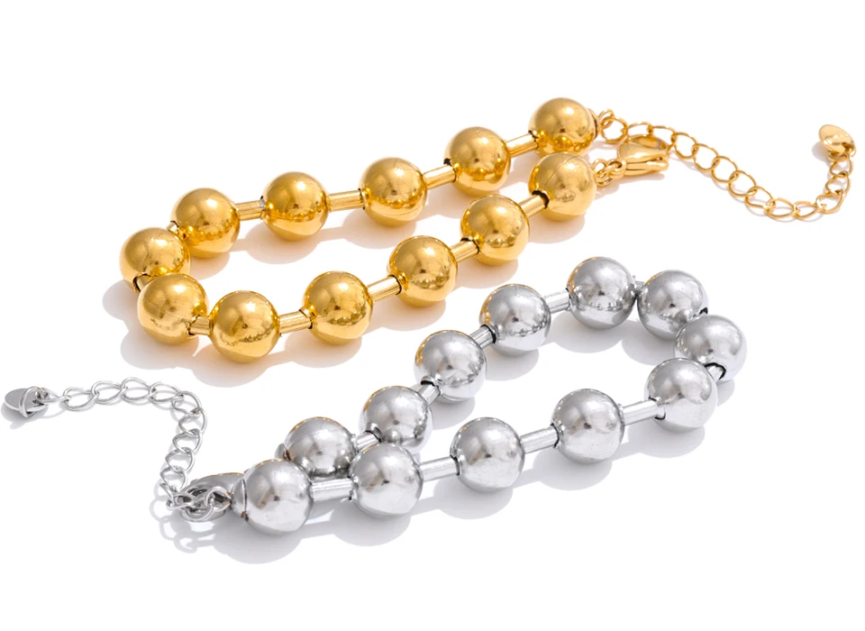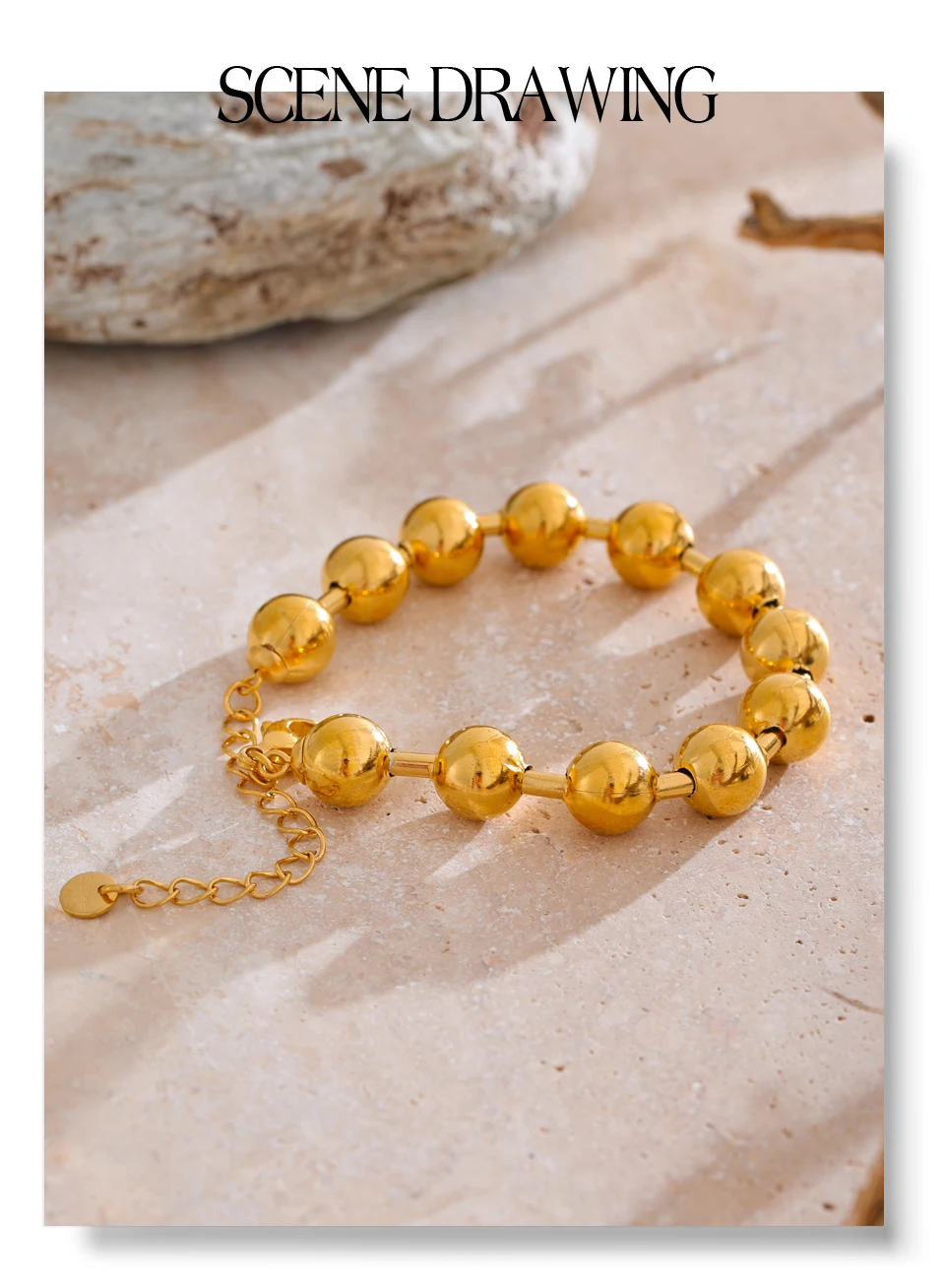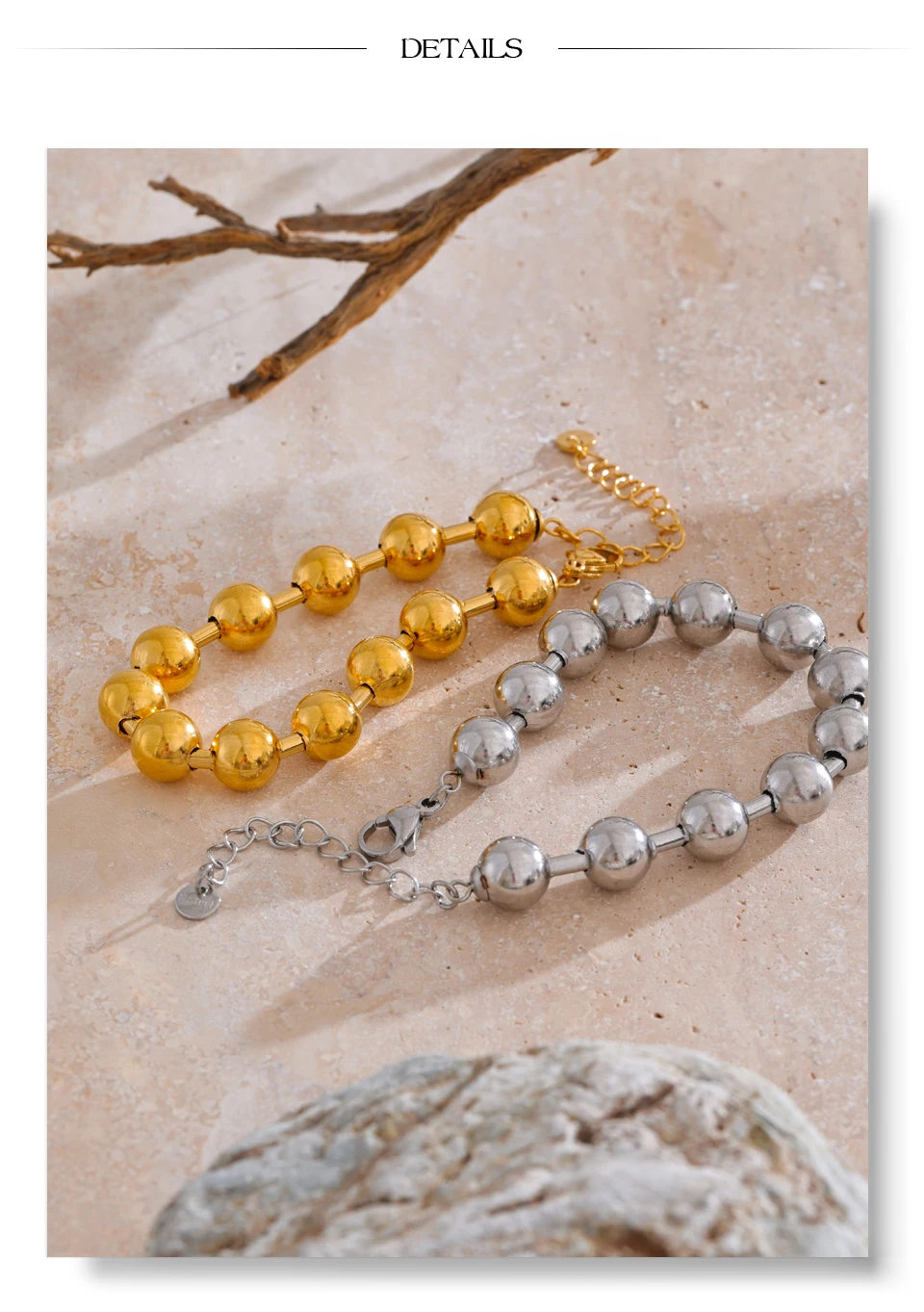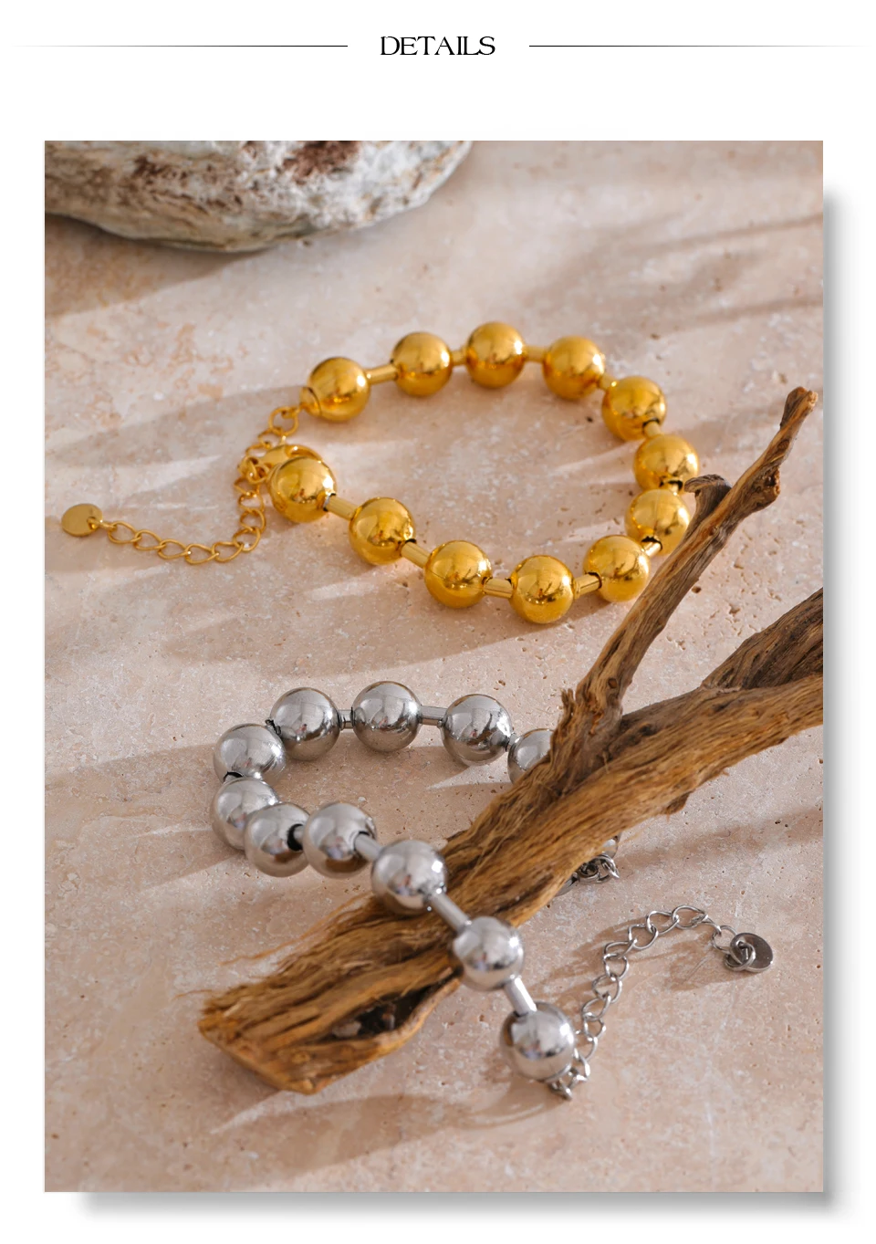 The LUMA BAR bracelet is a tribute to clean lines and tactile elegance. Featuring a rhythmic sequence of oversized, high-polish metallic spheres, it creates a fluid, liquid-gold effect on the wrist that transitions seamlessly from a daytime professional look to an evening statement.