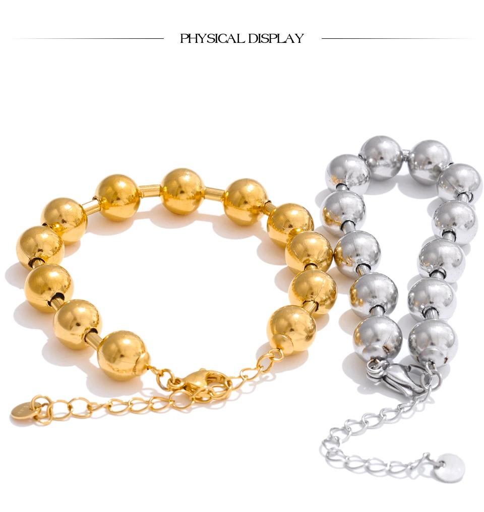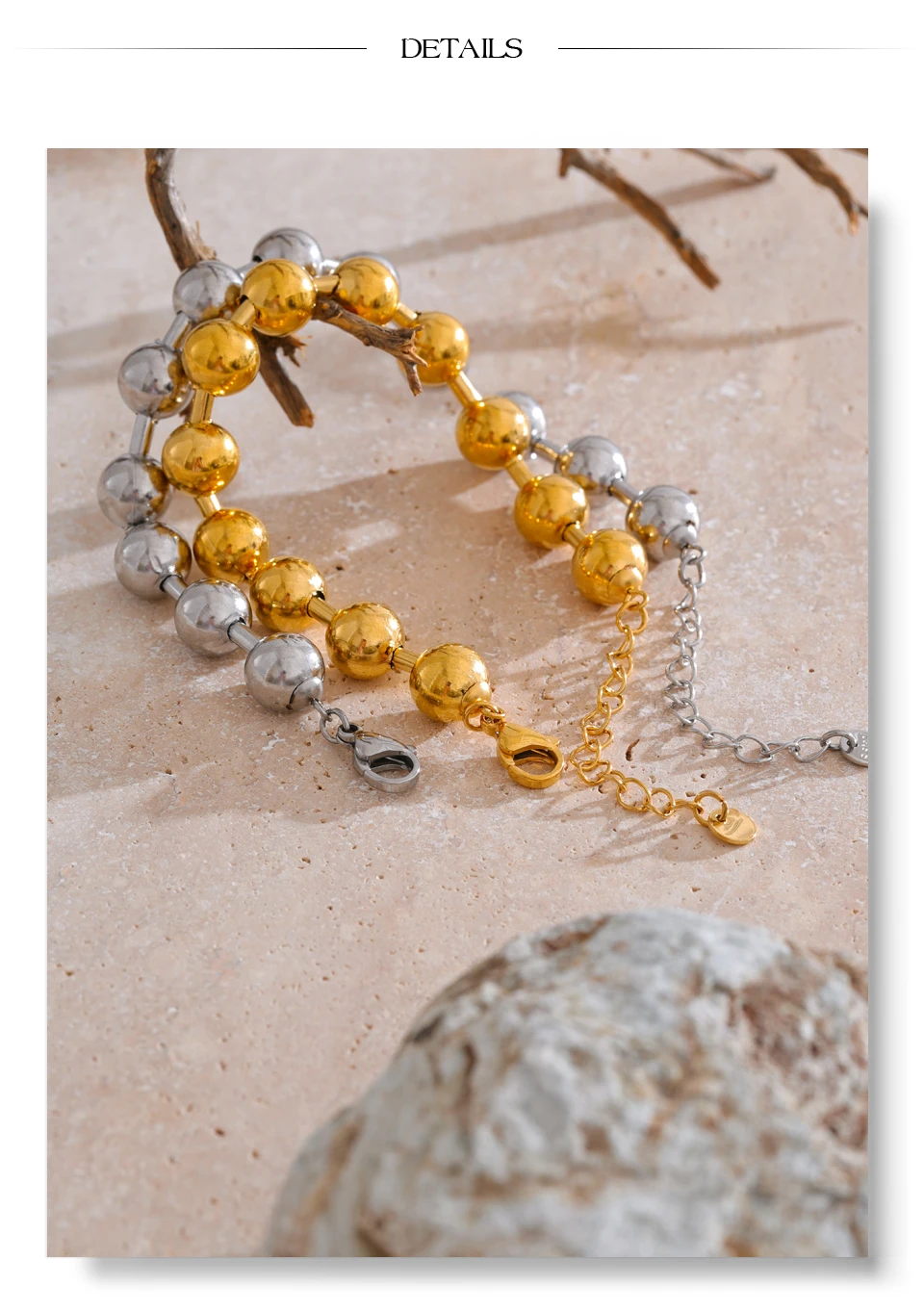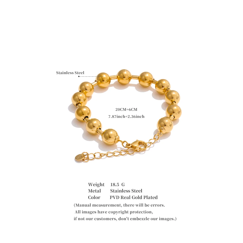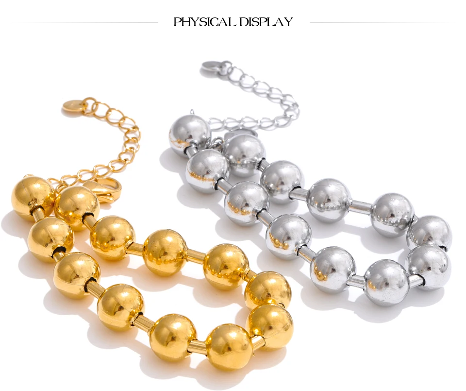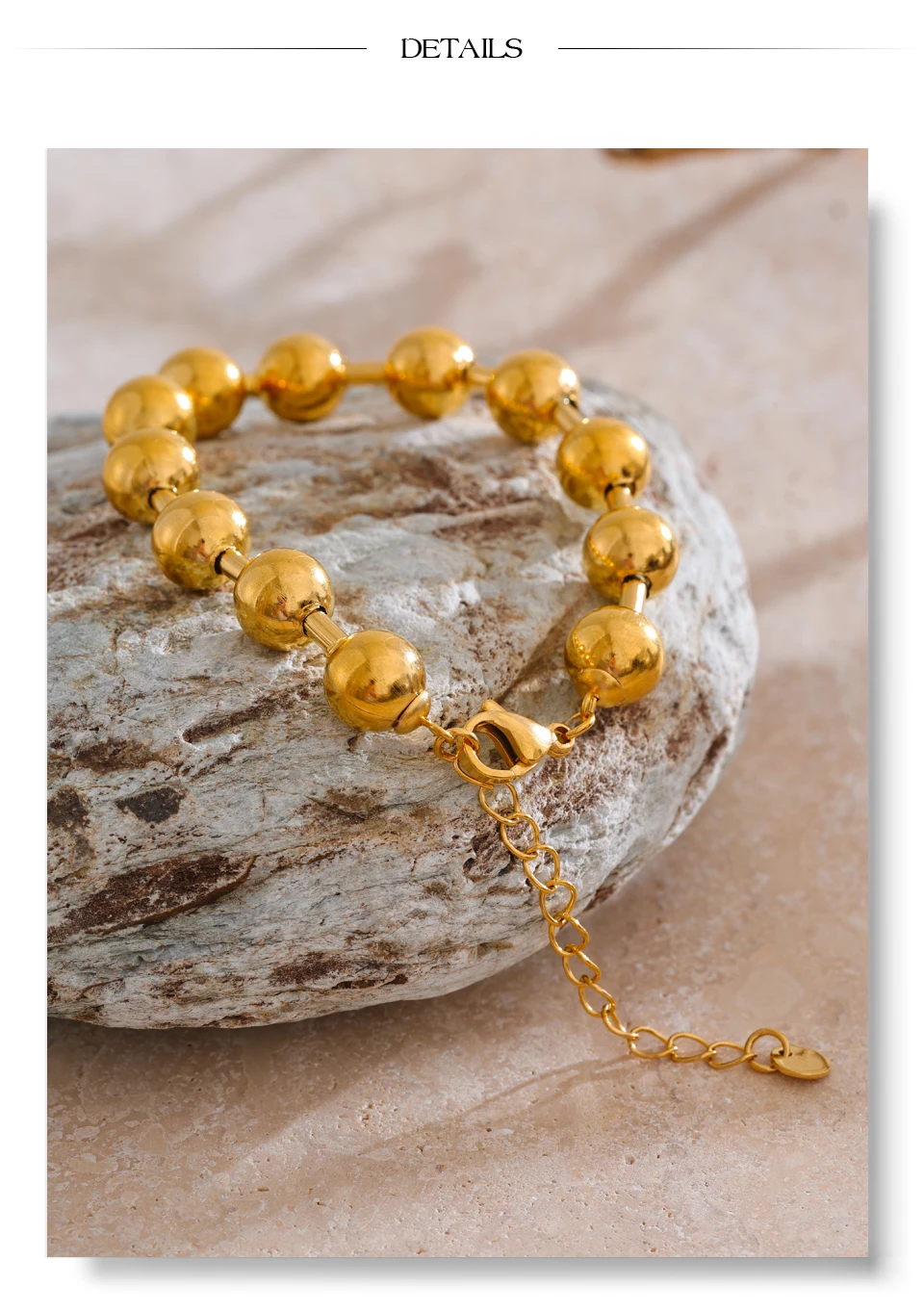 The LUMA BAR bracelet is a tribute to clean lines and tactile elegance. Featuring a rhythmic sequence of oversized, high-polish metallic spheres, it creates a fluid, liquid-gold effect on the wrist that transitions seamlessly from a daytime professional look to an evening statement.